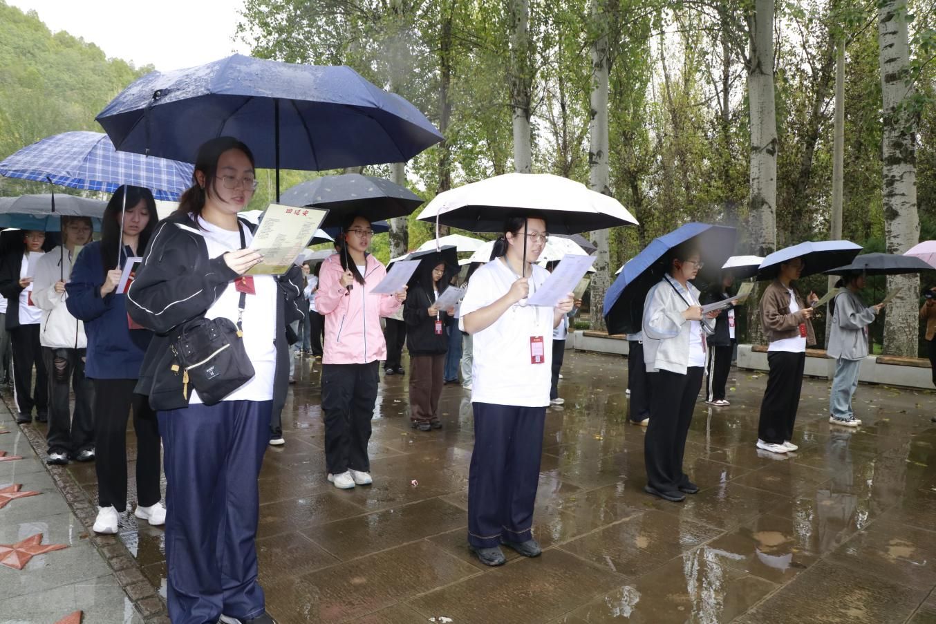 下午,实践队走进枣园革命旧址,齐声诵读《为人民服务》,学生党员在党旗下重温入党誓词,“人民至上”的理念在沉浸式学习中厚植于心。